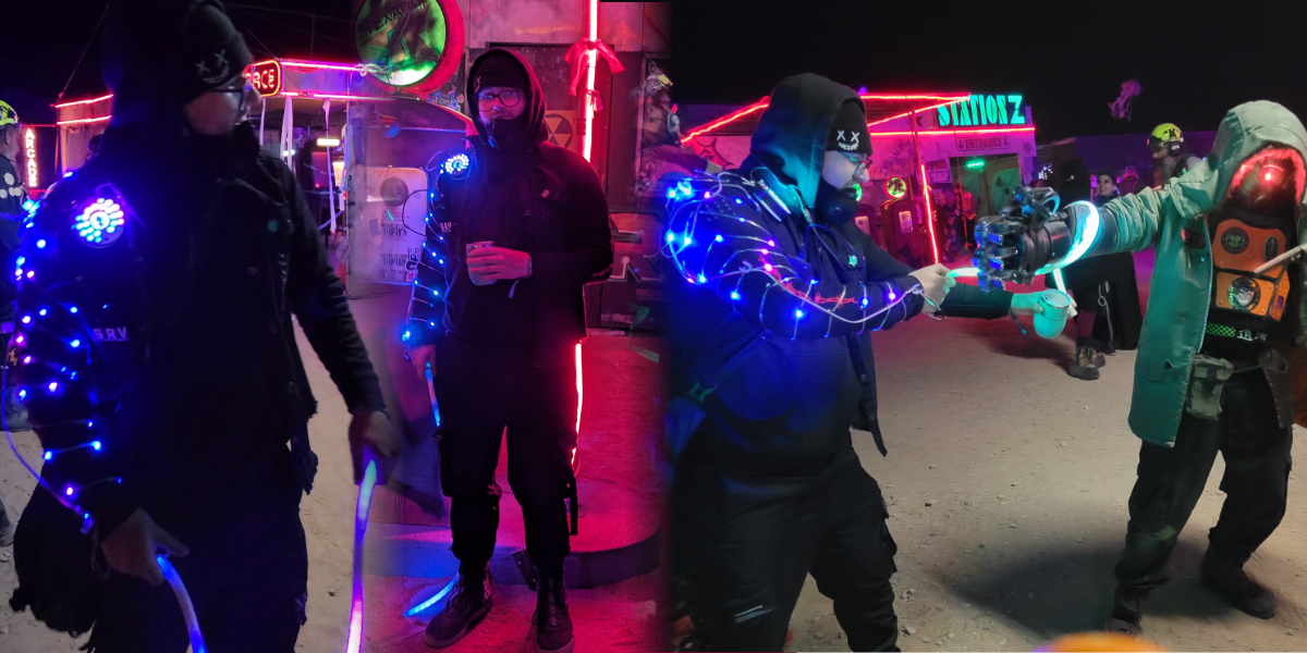 The first iteration of The Jacket was made for a Cyberpunk style event called Neotropolis. It had 7 unique modes/patterns.